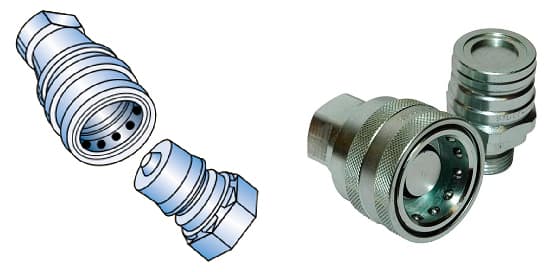 Los acoplamientos de cara plana tienen una válvula de cierre en cada mitad de la pareja. La mayoría limitan las fugas durante el desacoplamiento a sólo una película de aceite en las superficies de acoplamiento y previenen la entrada de aire durante el acoplamiento. También están diseñados para una restricción mínima del flujo, lo que minimiza la caída de presión durante el funcionamiento del equipo.
