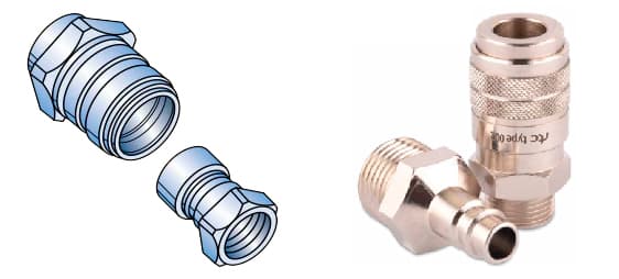 El enchufe es la mitad masculina y la toma es la mitad femenina. Cuando se conectan correctamente, estas partes sellan y bloquean la unión de manera efectiva para contener las presiones internas y resistir cualquier fuerza de tensión que tienda a separar la unión. Las piezas se desconectan fácilmente sin herramientas, desbloqueando un mecanismo de bloqueo y separando las partes.