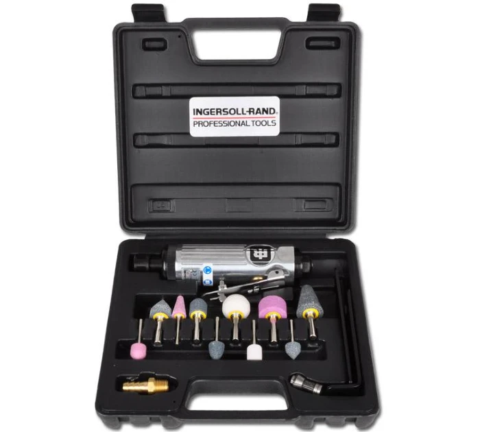 Amoladora neumática de troqueles con maletín con accesorios de Ingersoll Rand. Tiene una potencia de 220 W, alcanzando una velocidad máxima de 20000 rpm.