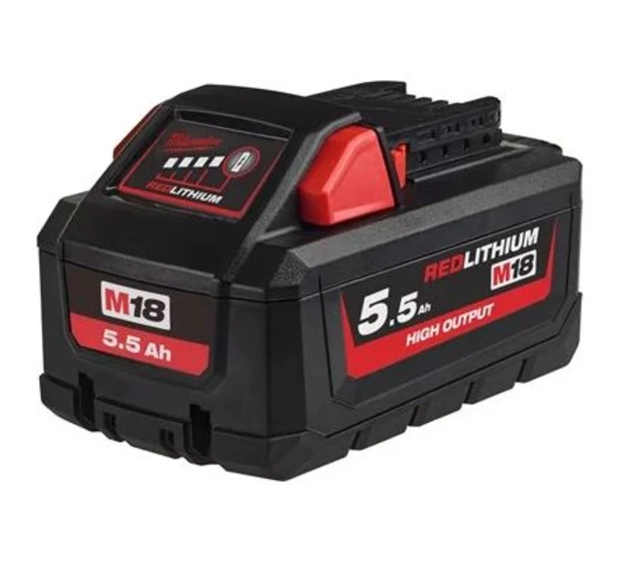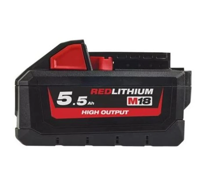 Batería Milwaukee M18™ 5.5Ah HIGH OUTPUT™. Más potencia, mejor refrigeración y máxima autonomía para trabajos exigentes.