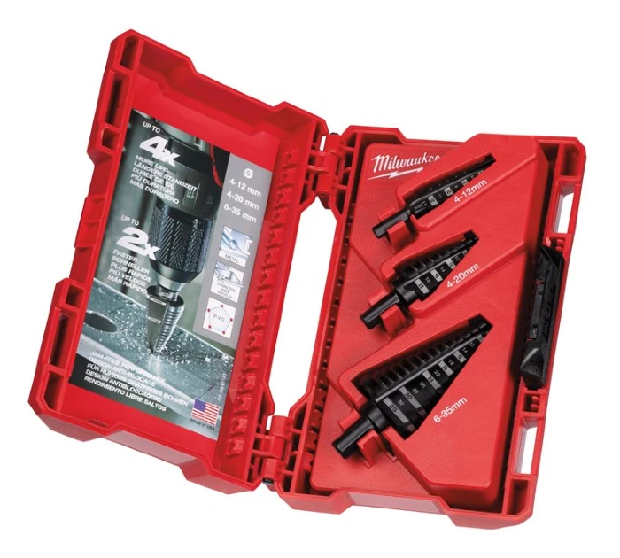 Kit de brocas escalonadas Milwaukee con 3 unidades de 4–12 mm, 4–20 mm y 6–35 mm. Perforación rápida, precisa y sin rebabas en metal, plástico y más.