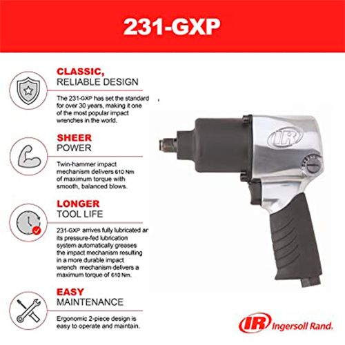 La llave de impacto neumática Ingersolll Rand 1/2 231GXP está diseñada para ofrecer un rendimiento profesional de hasta 678Nm. Perfecto para uso en talleres e industria. Cuenta con mecanismo Twin Hammer para una mejor distribución de la energía.